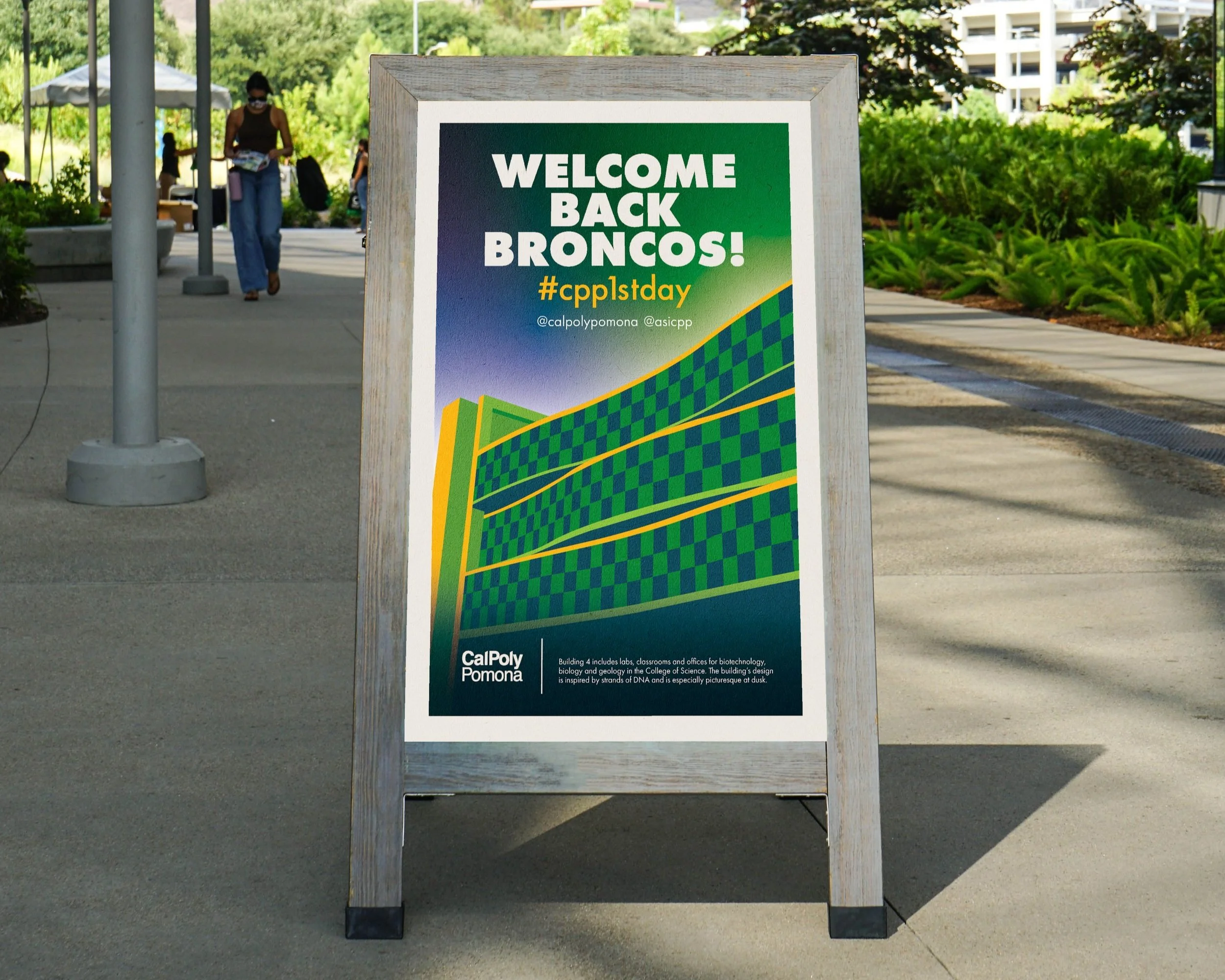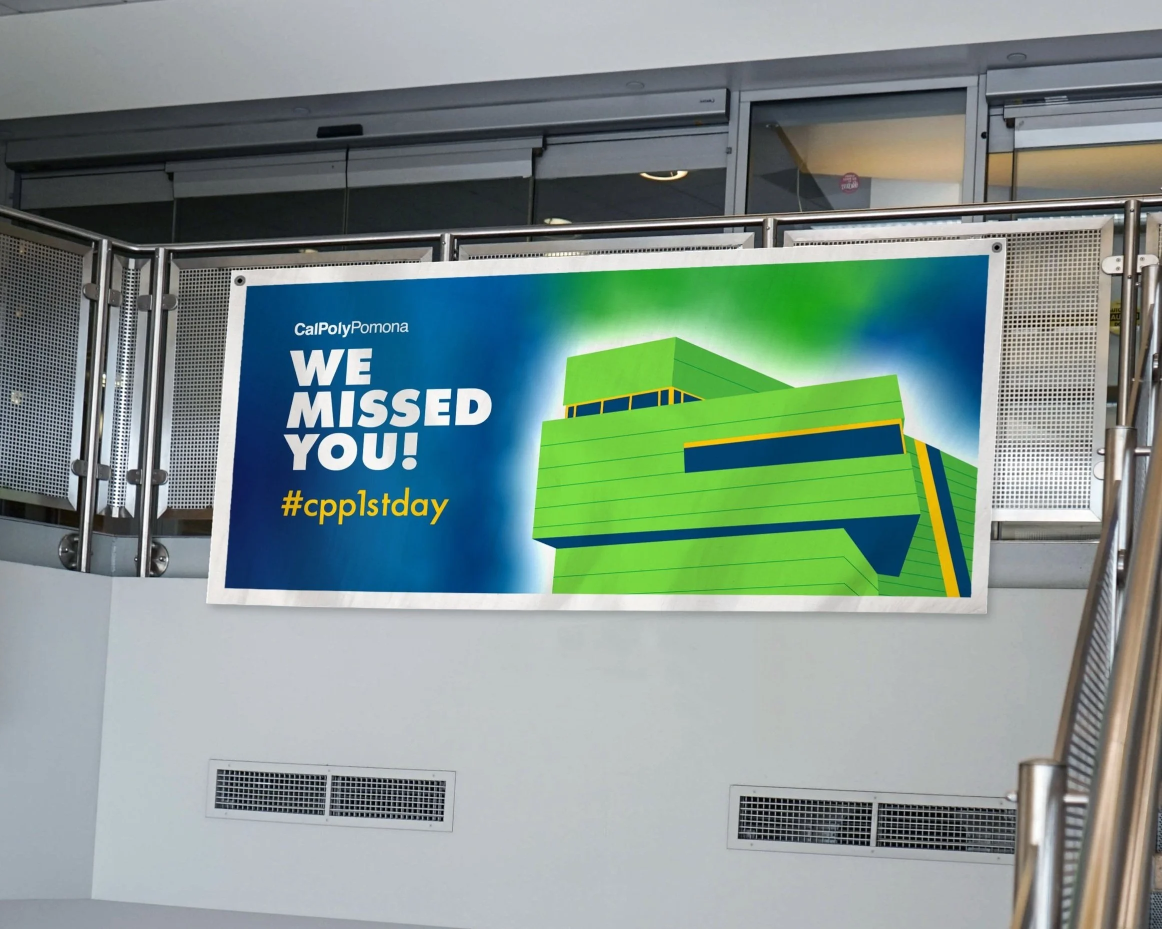 Project designed to welcome students, faculty, and staff to the Cal Poly Pomona campus after the COVID-19 pandemic as classes transitioned to in-person. The campaign consisted of posters, banners, social media posts, marquee displays, and screens all across campus with welcoming phrases with iconic campus buildings to complement them.